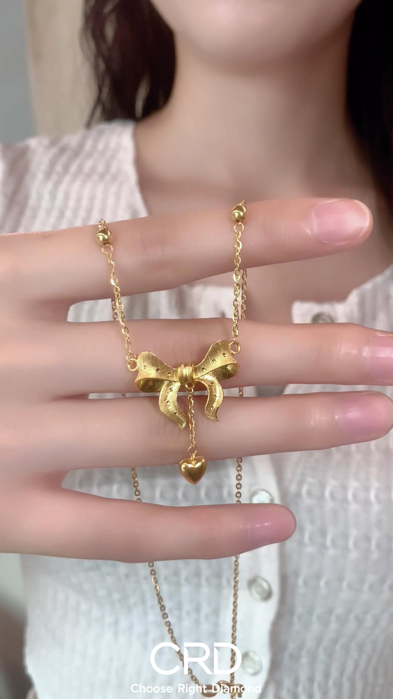 每一处细节都经过精心雕琢,仿佛是艺术家笔下的杰作。蝴蝶结的褶皱处,细腻而逼真,仿佛能感受到微风拂过时的轻轻颤动。足金的质感与蝴蝶结的柔美完美融合,既彰显了黄金的尊贵与奢华,又不失少女的甜美与俏皮。当你佩戴上这款项链,它便如同一个温柔的守护者,紧紧贴合在你的颈间。那璀璨的光芒,如同夜空中的繁星,照亮你的脸庞,让你瞬间成为人群中的焦点。无论是搭配简约的白色衬衫,还是华丽的晚礼服,它都能为你的造型增添一份独特的魅力。在阳光的照耀下,足金的光泽与蝴蝶结的灵动相互映衬,仿佛整个世界都变得明亮起来。